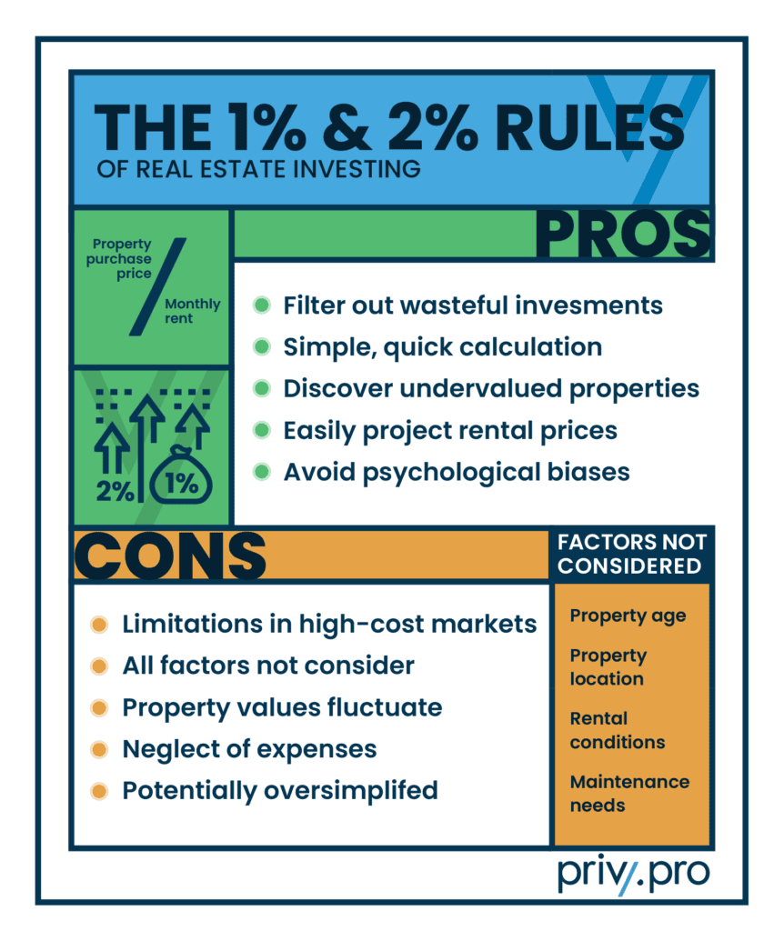 The 1% and 2% rules should not be considered in the absence of other calculations or software. These strategic guidelines enable investors to quickly determine whether a property is worth exploring further without investing time or money in considering it further.